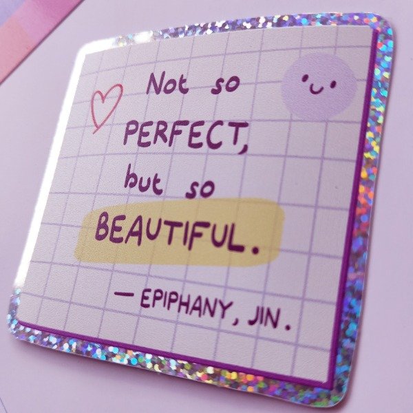 Sticker impreso en vinilo holográfico glitter, resistente al agua y al roce.